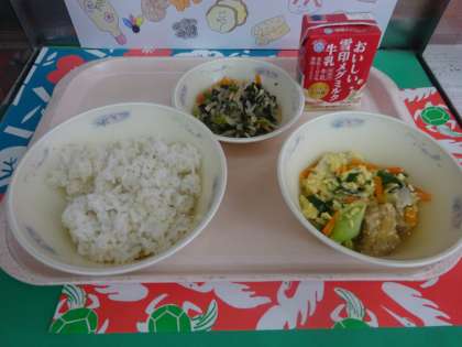 今日の給食は、麦ごはん・牛乳・厚あげの卵とじ・ほうれん草と切干大根のごま煮でした。