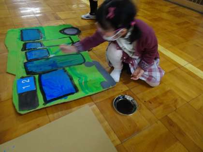 図工の時間に、「おひさま のりものにのってでかけよう!!」で使うバスを絵の具で彩色しました。みんな楽しそうに彩色しており、素敵なバスになっています。