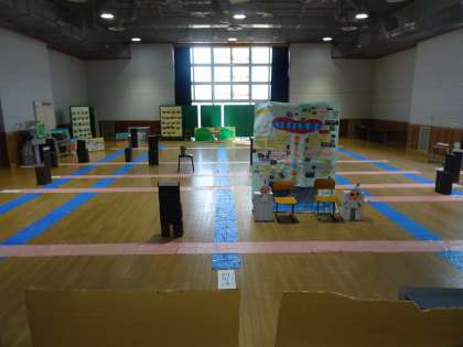 今日は、ついに、ひまわりホールにおひさま学級の子どもたちが作った作品や掲示物を置き、出かけた通りを置いて等のセッティングを行ってから、おひさま学級の子どもたちをひまわりホールへ呼びました。おひさま学級の子どもたちは、いつもと違うひまわりホールの様子を見て、とてもびっくりしていました。「すごいね!この場所でおひさま学級のみんなが発表するのだね!」「気合いが入ってきたー!」「お客様がわかるような発表をしたいな!」等々の嬉しい言葉があがっていました。
