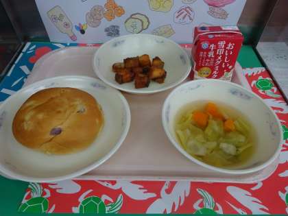 1月13日(金)の給食は、おさつコッペパン・牛乳・さけのアングレス・野菜のスープ煮でした。