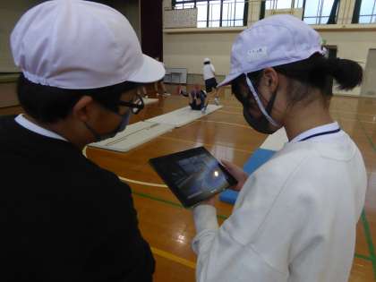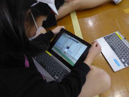 5年生 体育科〜マット運動〜 公開日 2023/01/17 更新日 2023/01/17 5年生のページ マット運動でもGIGA端末を使っています。自分の技を見直したり、お手本と比べたりしています。技の精度も少しずつ上がってきています。