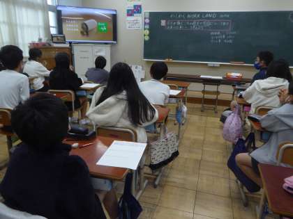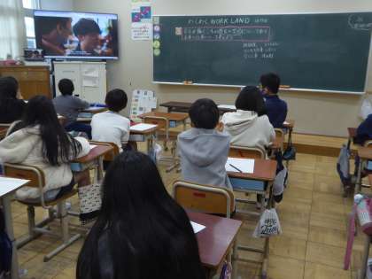 生き方探求学習である「わくわくWORK LAND」の学習が始まりました。仕事体験を経験し未来を切り拓く生きる力の育成を図ることをねらいとしています。今日は動画を通して未来の社会や仕事について話し合いました。