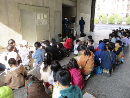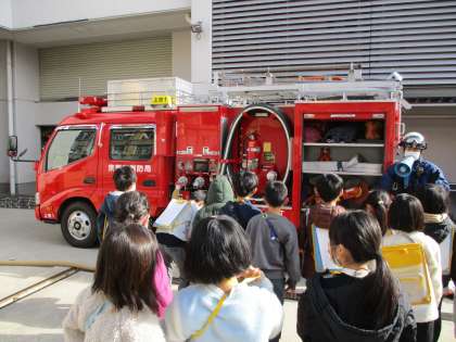 社会科の学習で、消防署に見学に行きました。消防車やはしご車の仕組みについて教えていただいたり、施設の中を見学させていただいたりしました。質問にもたくさん答えていただき、消防士さんの仕事についてとても詳しく知ることができました。