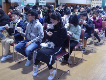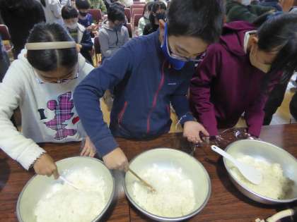 子どもたちが育て収穫したお米を炊いて食べました。地域の方を招き、今までお手伝いただいた感謝の気持ちも伝えました。炊き立てのお米はすごい美味しかったです。