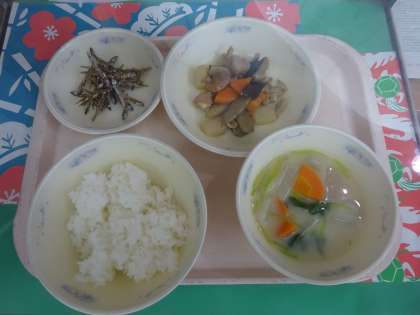 今日の給食は、ごはん・煮しめ・ごまめ・京風みそ汁でした。今日は和食を味わう日、なごみ献立でした。