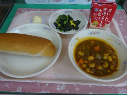 今日の給食は、全粒粉パン・牛乳・チリコンカーン・ほうれん草のソテーでした。チリコンカーンは、アメリカの料理です。カレー粉を少し加えており、スパイシーな味が子どもたちに人気です。