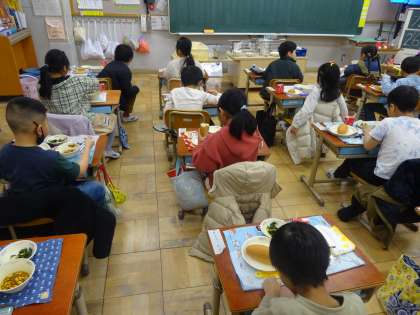 給食週間中は、給食委員会の子どもたちが、みんなからいただいた好きな給食についての投稿を全校放送で紹介しています。自分のクラスのお友達の投稿が紹介されると、うれしそうにしていました。