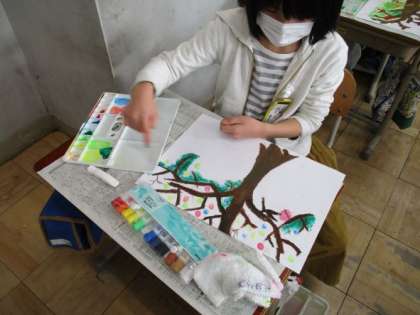 そして、指に絵の具をつけて、冬の木に葉や実がついているかのように、カラフル色をつけていきました。