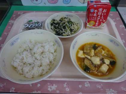 今日の給食は、麦ごはん・牛乳・とうふの四川風・切干大根のいためナムル・じゃこでした。