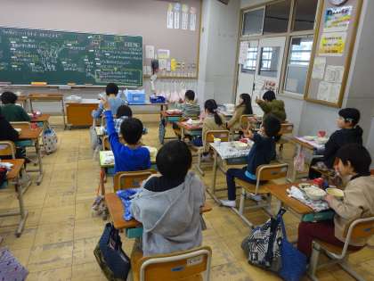 とうふの四川風は、豆板醤を使い少しピリッとした味になっています。トマトケチャップも使っているので、子どもたちにとっても食べやすい味付けになるように工夫をしています。おかわりにもたくさんの手が挙がっていました。