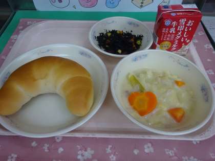 今日の給食は、バタークロワッサン・牛乳・キャベツの米粉クリーム煮・ひじきのソテーでした。