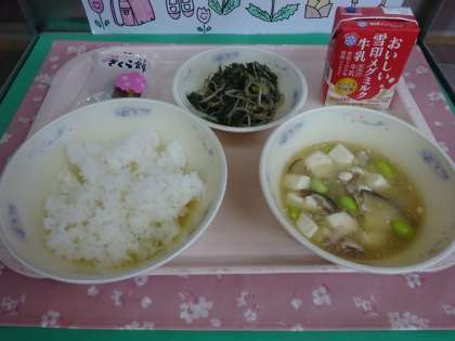 今日の給食は、ごはん・牛乳・豚肉ととうふのくず煮・ほうれん草ともやしのごま煮・さくらもちでした。