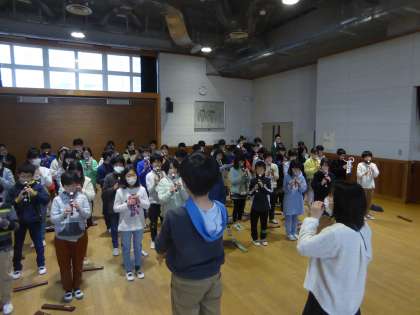 6年生を送る会が8日にあります。その日に向けて練習を頑張っています。今日は全体で集まって演奏とダンスの練習です。