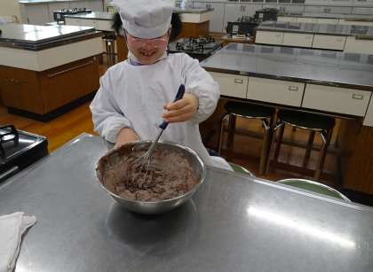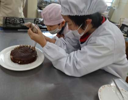 2月のお誕生日会で、「チョコレートケーキを作ってみたい」という子どもたちの希望で、チョコレートケーキを作りました。ホワイトボードに、作り方の手順表をのせると、子どもたちは、手順表を見ながら自分たちで協力しながら作ることができました。この1年間で様々な調理活動を行ってきましたので、調理を行うスピードがはやくなったなと感じました。最後に、チョコ味のホイップクリームでデコレーションを行い、ケーキが完成しました!おいしいケーキができて、子どもたちはとても喜んでいました。