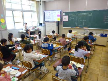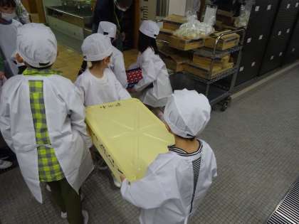 給食当番の人は、給食室へ給食を取りに行ったり、教室でみんなの給食を配ったり、どきどきしながらも頑張ってお仕事をしていました。