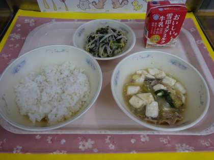 今日の給食は、麦ごはん・牛乳・五目どうふ・ほうれん草ともやしのいためナムルでした。