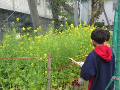 運動場や中庭で、生物を観察しました。観察する前に、「チョウは花のみつをすっていると思う」「菜の花の花が咲いていると思う」と予想していました。チョウだけでなく、卵やダンゴムシ、幼虫も見つけることができました。植物の名前を図鑑で調べながら観察している人もいました。また、暖かくなったら生物の様子を観察したいですね。