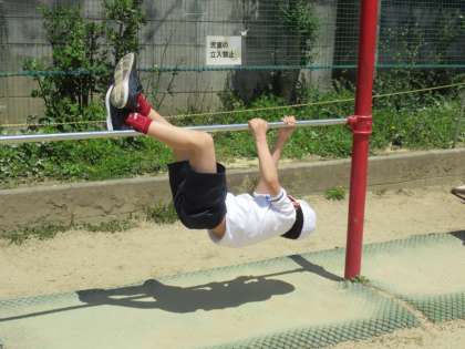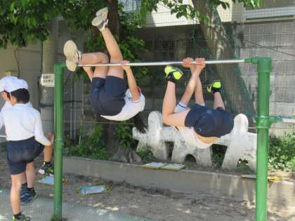体育の「てつぼう運動」の学習では、仲間と教え合いながらいろいろな技に挑戦しています。「おしい」「やったね」「うまいね」などとお互いに声を掛け合いながら取り組む姿が見られました。