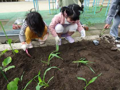 おひさま学級 「おひさま畑の苗植えを行いました!」 公開日 2023/05/08 更新日 2023/05/08 おひさま学級 地域の方々にご協力いただきながらおひさま畑の苗植えを行いました。子どもたちと相談しながら秋まで育てる野菜や花を決めました。ナス、トウモロコシ、サツマイモ、フルーツトマト、サンパラソル、ヒマワリを育てます。今後の生長が楽しみです!