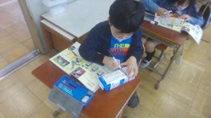 理科の学習でツルレイシの種を植えました。持ってきた牛乳パックを上手に切って鉢を作りました。「上手に種を埋められた」「芽が出ることを楽しみ」などツルレイシの成長をとても楽しみにしている様子でした。