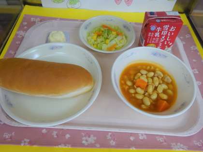 5月16日の給食は、ミルクコッペパン・牛乳・大豆と鶏肉のトマト煮・野菜のソテー・チーズでした。
