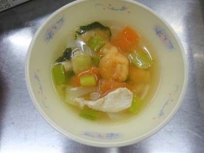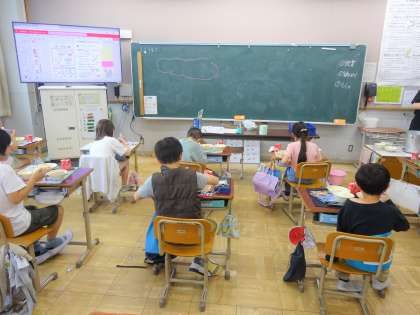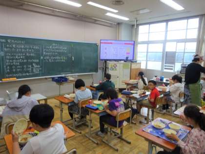 だご汁は、大分県の郷土料理です。給食では、トマトをつぶして少し混ぜて作った生地を調理員さんがスプーンを使ってだんごを手作りしています。ほんのりピンクの色がかわいく、もちもちしていました。トマトのさわやかな味で、さっぱりと食べられました。