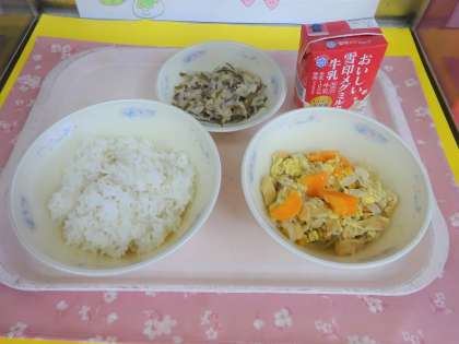 今日の給食は、麦ごはん・牛乳・油あげのチャンプル・クーブイリチーでした。沖縄料理でした。