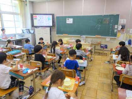 5月23日(火)の給食は、黒糖コッペパン・牛乳・コーンのクリームシチュー・ほうれん草のソテーでした。