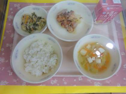 今日の給食は、麦ごはん・牛乳・鶏肉のてりやき・切干大根のごま煮・キャベツのすまし汁でした。