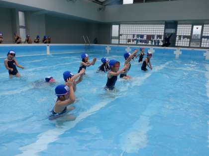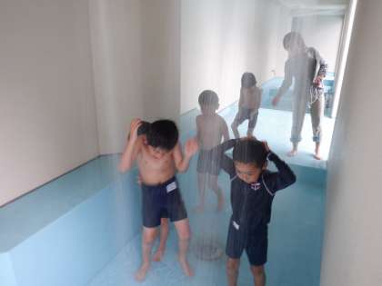 今日はくもりで少し水が冷たかったですが、「あるく」「かにさん」「ロケット」などをしながら、楽しみました。明日もあるので,みんなで安全に楽しく学習できればと思います。