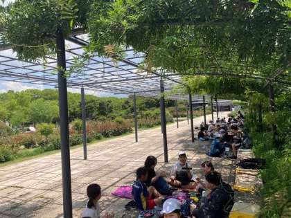 バラ園の近くでお弁当です。おいしそうに食べています。天気もよく、暑いくらいです。