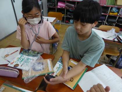 6年生 理科〜体のつくり〜 公開日 2023/06/19 更新日 2023/06/16 6年生のページ 自分の脈拍はどれくらいだろう。手首に指を当ててじっくりはかりました。また、聴診器を使って心臓の音を聞いてみました。