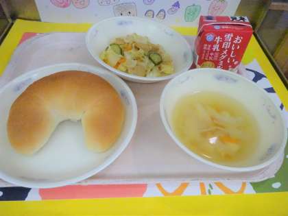 今日の給食は、バタークロワッサン・牛乳・ソーセージと野菜のいためナムル・とうふのスープでした。