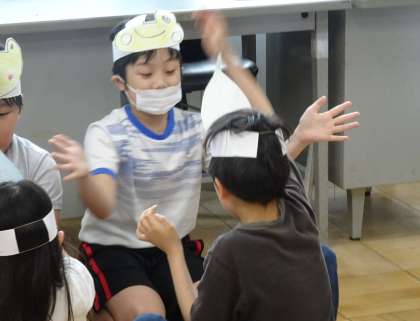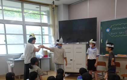 おひさま学級のみんなと1年生がつながるように。おひさま学級の子どもたちが考えた「おひさまつなぐんプロジェクト」を行いました。今日は、1−2と交流を行いました。1年生が楽しめるように、それぞれ担当を決めて、ペープサートを使った本の読み聞かせ「おにぎりくんがね・・・」、歌あそび「あめあられ」、ダンス「チェッコリダンス」を行って、交流を楽しみました。おひさま学級の子どもたちが、1年生の先輩となって、かっこよく教えている姿を見て、心が温まりました。また、1年生がにこにこしながら「おひさま学級のみんなと一緒にできて楽しかった!」と発表しており、おひさま学級の子どもたちは嬉しそうでした!次回は、6月22日(木)に、1−1と交流を行います。「次のおひさまつなぐんプロジェクトも成功するぞ!」と子どもたちは、話をしていました。