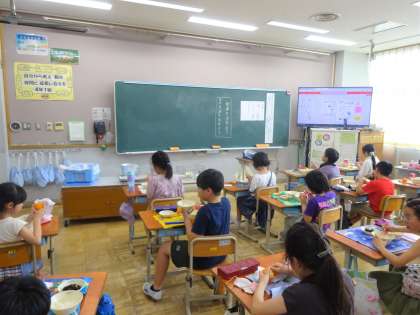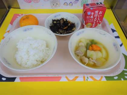 今日の給食は、ごはん・牛乳・鶏肉と野菜の煮つけ・ひじき豆・みかんでした。鶏肉と野菜の煮つけは、じゃがいもや玉ねぎ、にんじん、三度豆が入っています。じゃがいもがやわらかくおいしく食べられました。