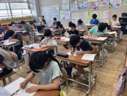 硬筆の学習で、俳句を書きました。見本をよく見て集中して書いたので、1枚書けたら「ふーーー。」「はーーー。」と疲れるくらい頑張っていました。