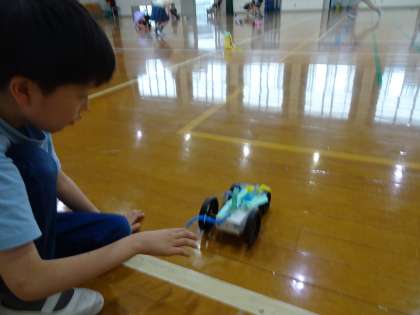おひさま学級 交流4年「ゴー!ゴー!ドリームカー」 公開日 2023/07/05 更新日 2023/07/05 おひさま学級 ゴムの力で動く「ゴー!ゴー!ドリームカー」を図工で作り、交流クラスの友だちと一緒に、車を走らせました。工夫やアイディアが詰まった乗り物が走っており、子どもたちは楽しそうでした!