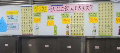 7月水分補給について 公開日 2023/07/07 更新日 2023/07/07 ぱくぱく通信 7月の給食室の掲示板のテーマは、「水分補給」についてです。水分には、体にとって大切な役割があります。 ジュースには、目には見えにくいですがたくさんのお砂糖が入っています。おいしいけれど、たくさん飲んで大丈夫なのでしょうか。ふと、立ち止まって考えていただけたらと思います。