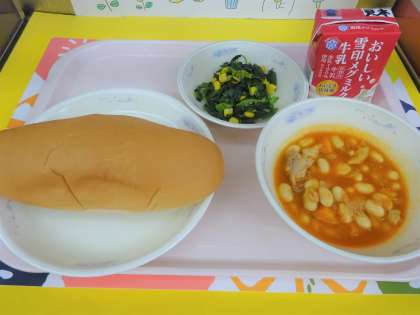 7月11日の給食は、コッペパン・牛乳・大豆と鶏肉のトマト煮・ほうれん草のソテーでした。