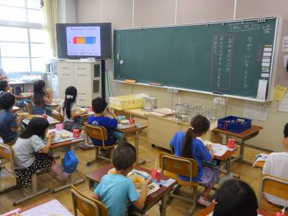 給食時間には、6月に全校児童に実施した食育アンケートの結果についてのムービーを見ました。苦手なものでも少しでも食べるという子が多いという結果でした。また、味覚を育てるうえでも、苦手なものでも食べていくことが大切と気がついていました。その日の給食から、頑張って食べようとしている子どもたちがたくさんいました。