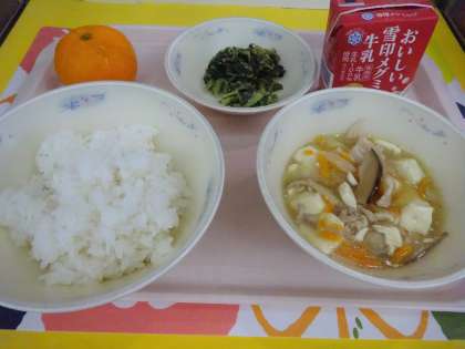 今日の給食は、ごはん・牛乳・鶏肉と豆腐のくず煮・だいこん葉のごまいため・みかんでした。