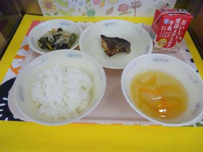 今日の給食は、ごはん・牛乳・さけの塩こうじ焼き・小松菜と切干大根の煮びたし・とうがんのくずひきでした。和食をいつも以上に味わうなごみ献立の日でした。