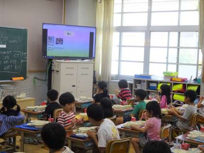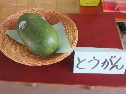 給食室前には、本物の冬瓜を展示していました。その大きさや重さに驚いている様子でした。写真の冬瓜は2キログラムほどでした。給食で使った冬瓜は4キログラムもありました。1学期にも冬瓜を食べたことを覚えていたようで、「冬まで保存できるから夏が旬だけど冬瓜っていうんだね。」と言っていました。今日はくずひきにして美味しくいただきました。