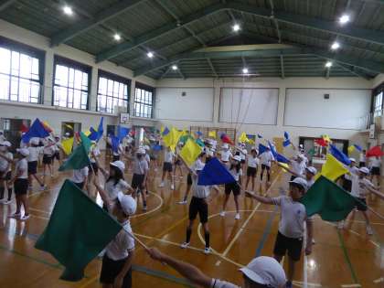 運動会に向けて演技の練習を始めました。6年生はフラッグを行います。本番まであと少し、しっかり練習を頑張ります。