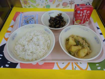 今日の給食は、麦ごはん・牛乳・じゃがいものそぼろ煮・ひじきの煮つけ・じゃこでした。