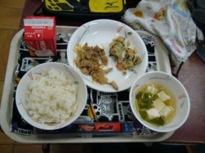 おからは、京都のおばんざいとして食べられています。素朴な味で、ご飯ともよく合って、子供たちにも大人気でした。花菜は、冬から春にかけておいしい京野菜です。まだまだ寒い日が続きますが、ほろ苦い花菜の味に、ちょっぴり春を感じました。今日も、ほとんど残菜はありませんでした。ごちそうさま。