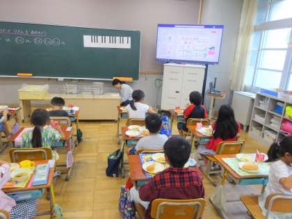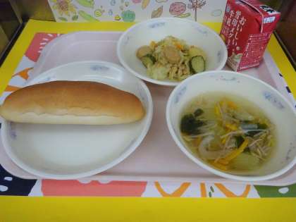 今日の給食は、コッペパン・牛乳・ソーセージと野菜のいためナムル・スープでした。今日のコッペパンは国産小麦100%の使用でした。よく噛んで食べて、小麦の甘みを味わっていました。