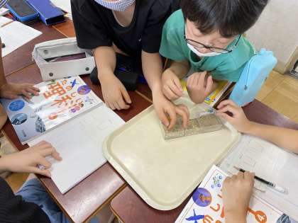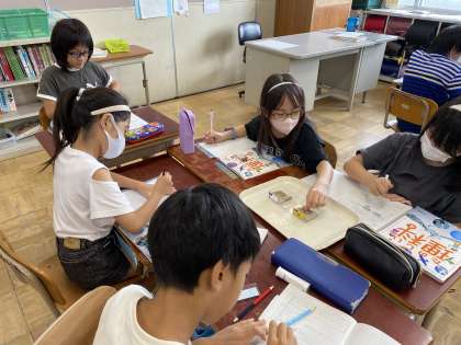 理科の学習では、土と砂の観察をしました。「土はさらさら」「砂はざらざらしていて、粒が大きい」など違いについて話し合う姿が見られました。