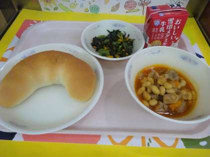 今日の給食は、バタークロワッサン・牛乳・ポークビーンズ・小松菜のソテーでした。