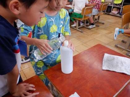 「水があふれなかったから、こっちのほうがたくさんはいるんだね!」と、確かめた結果をみんなで交流しました。